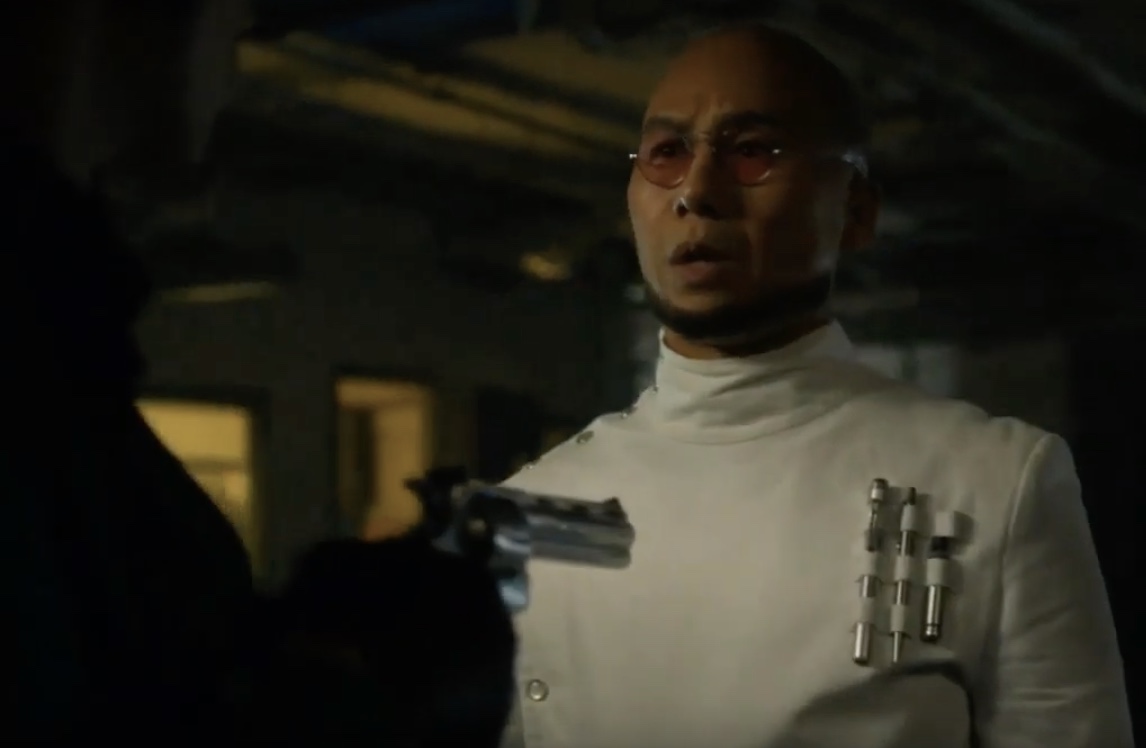 After opening up a bodybag, Hugo Strange is faced with an angered Edward Nygma, who points a gun at him.