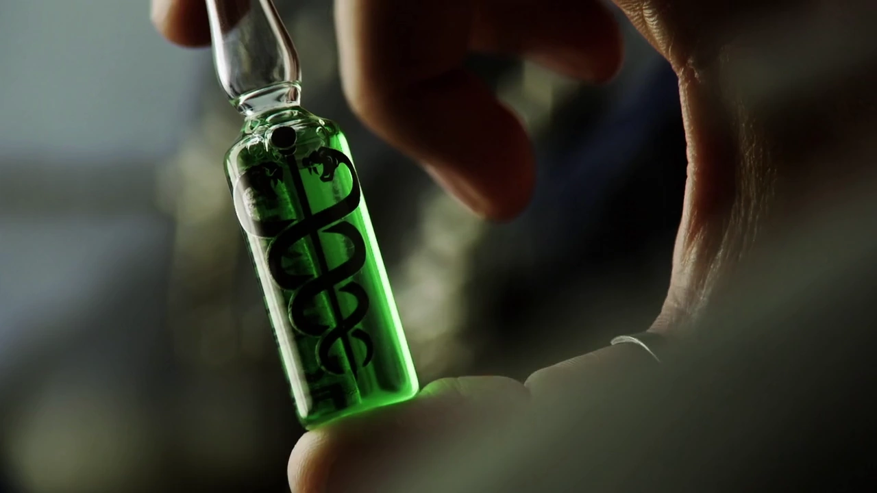 Gordon asks Nygma how the drug is manufactured, and Nygma says that the process is incredibly sophisticated; only someone with access to a state-of-the-art lab could do it. Gordon then asks who has the best-equipped lab in the city, to which Nygma responds "WellZyn", a pharmaceutical subsidiary of Wayne Enterprises. They are interrupted when Charmagne, the drug's latest victim, goes berserk before she can be put into the holding cells, throwing several officers around the room before the final effects take hold, and she collapses in a shapeless heap, dead.